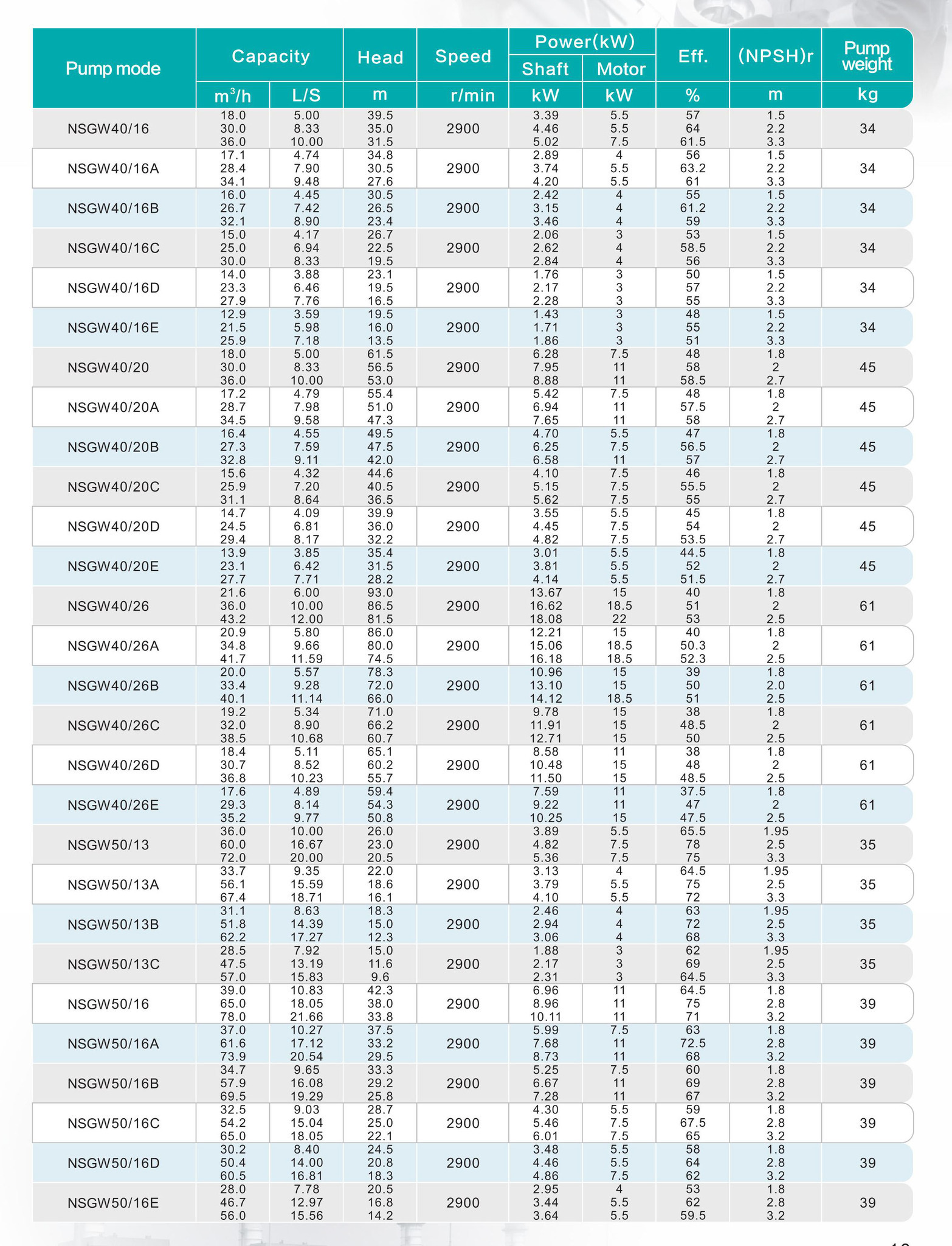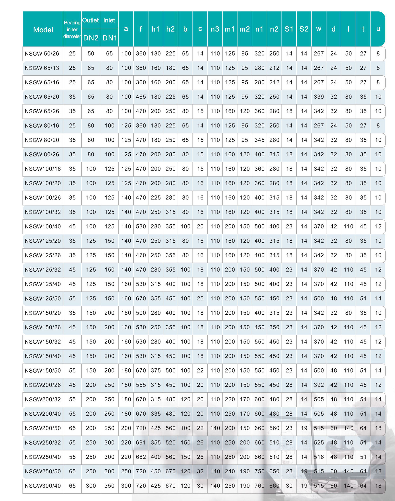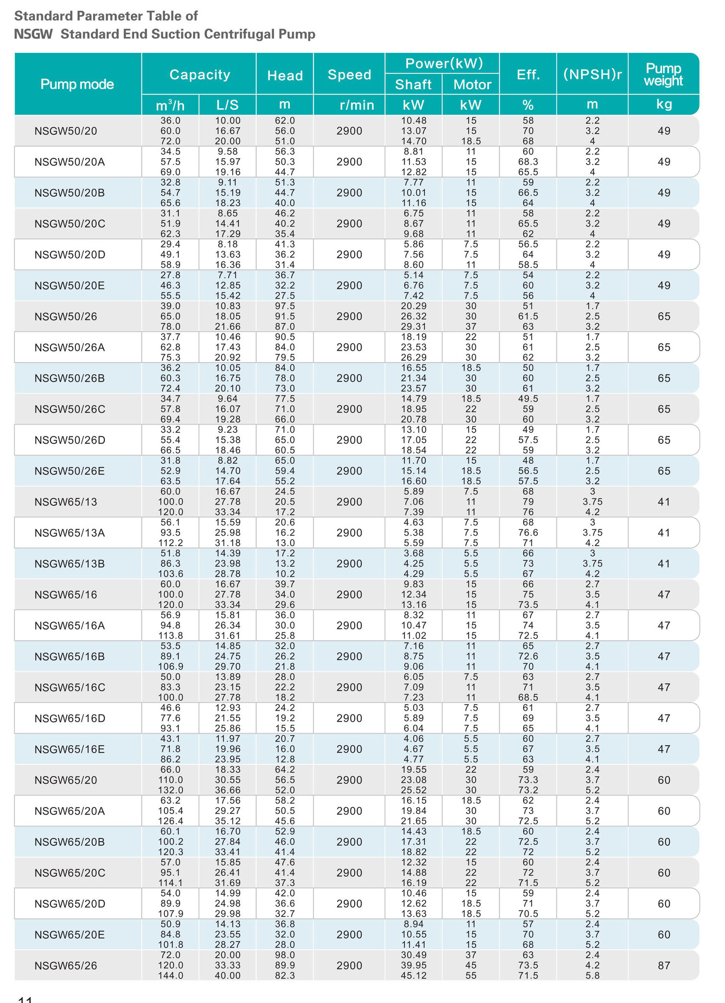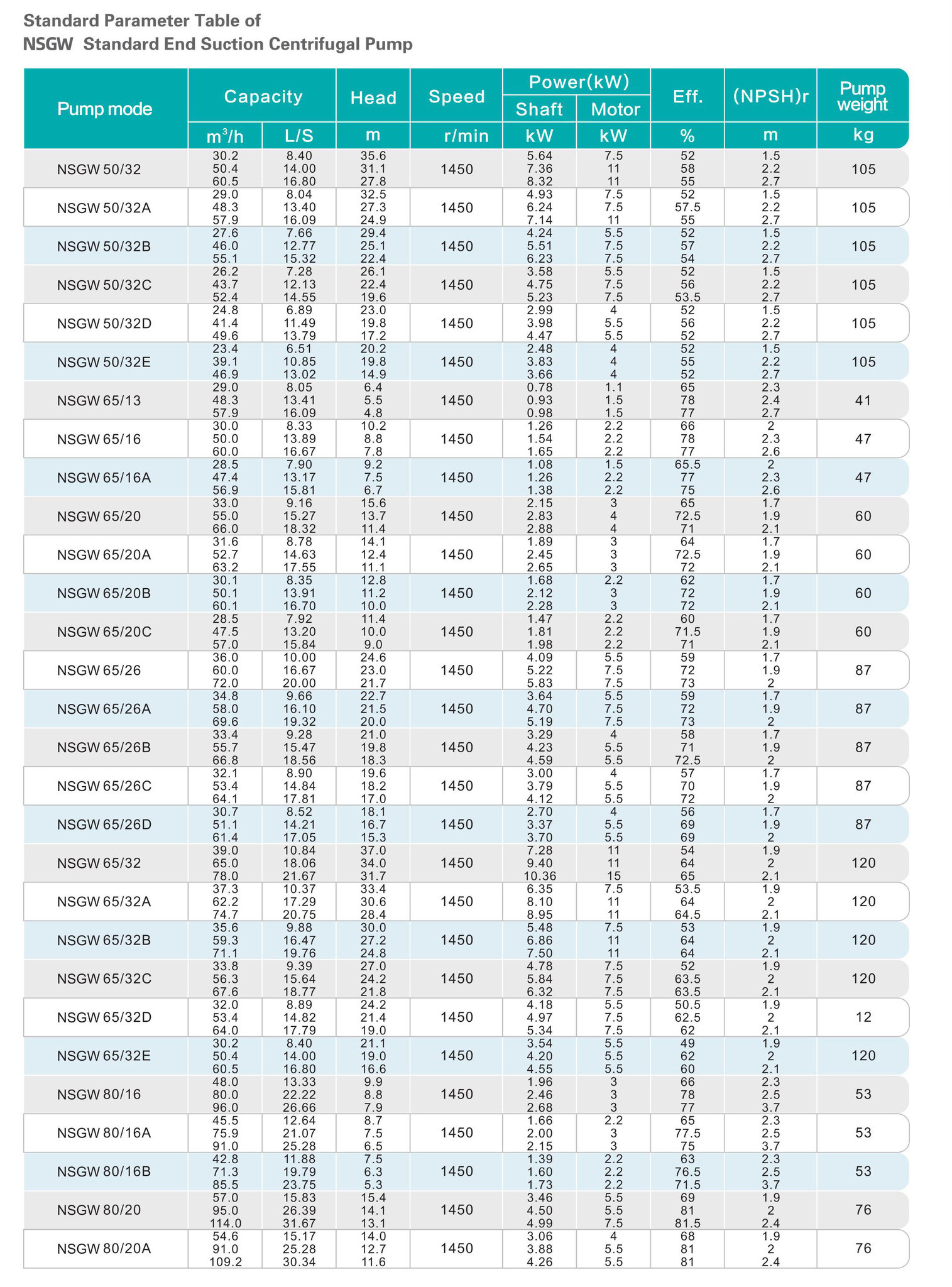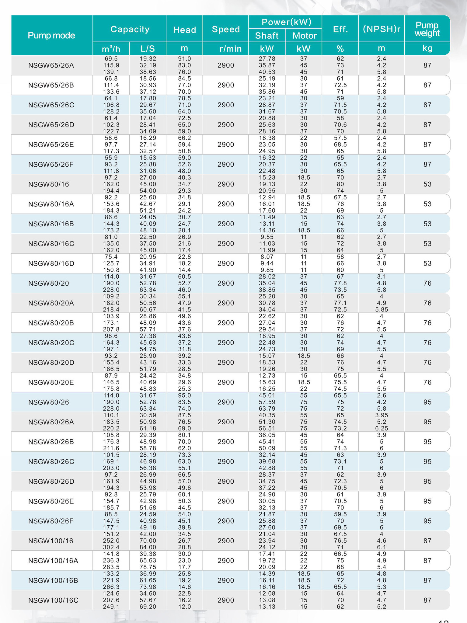 Насосы типа NSGW обладают широкой универсальностью, вся серия имеет 60 спецификаций, но валы используются только 4 видов, причем валы, подшипники, втулки, уплотнения валов, рабочие колеса, крепежные детали и т.д. одной спецификации могут быть взаимозаменяемы, а подвесок у всей серии насосов всего 5 видов.