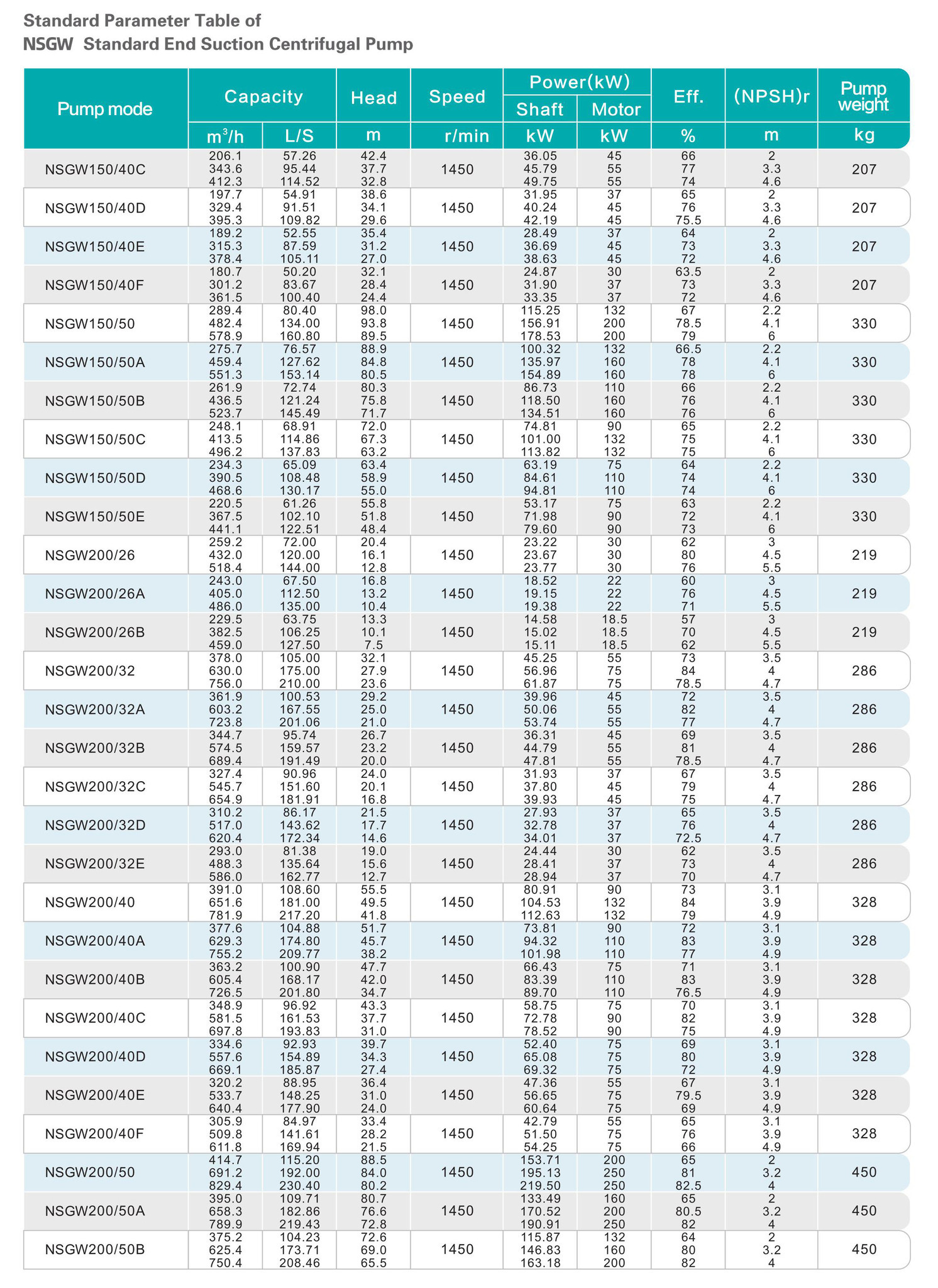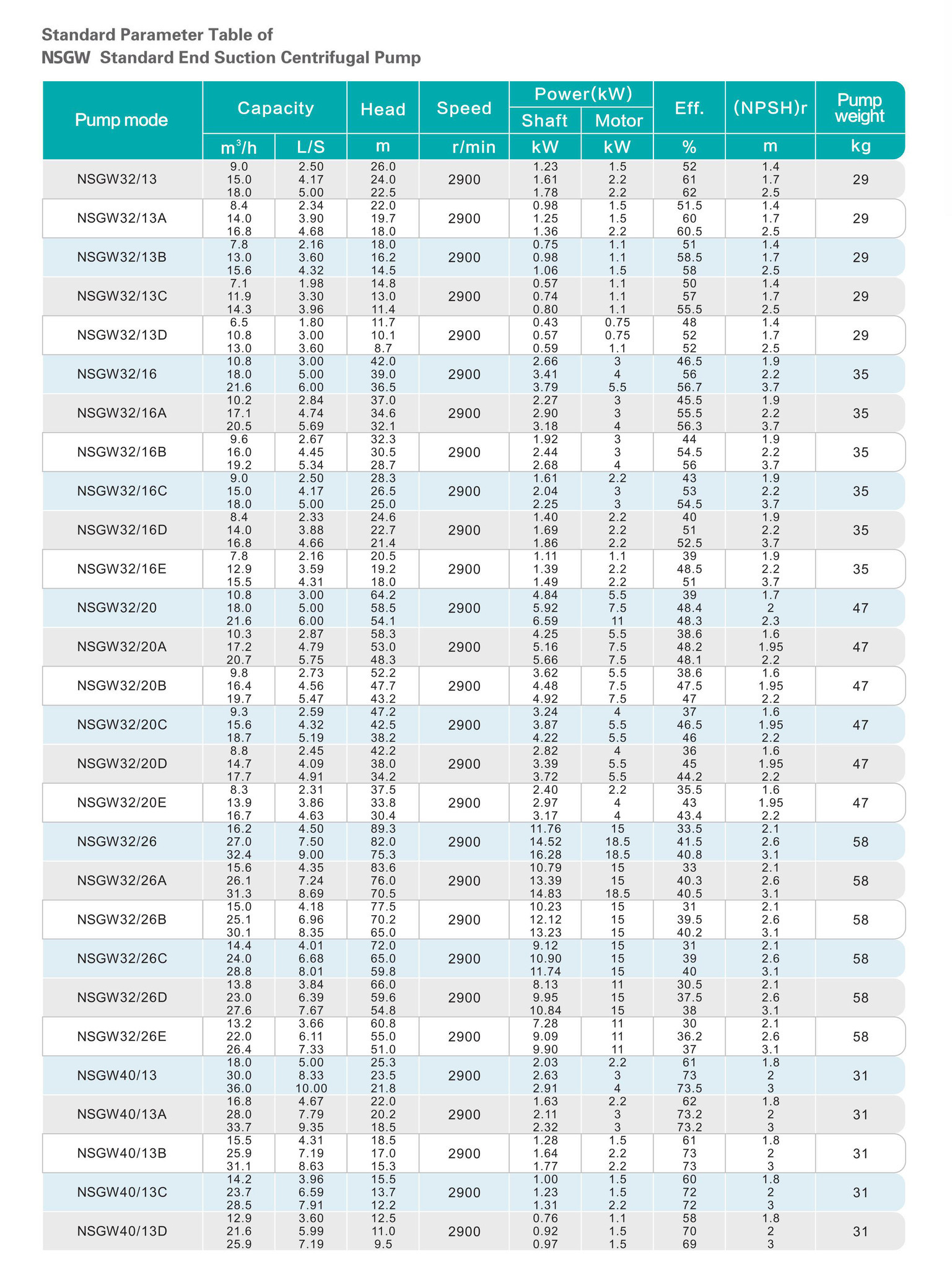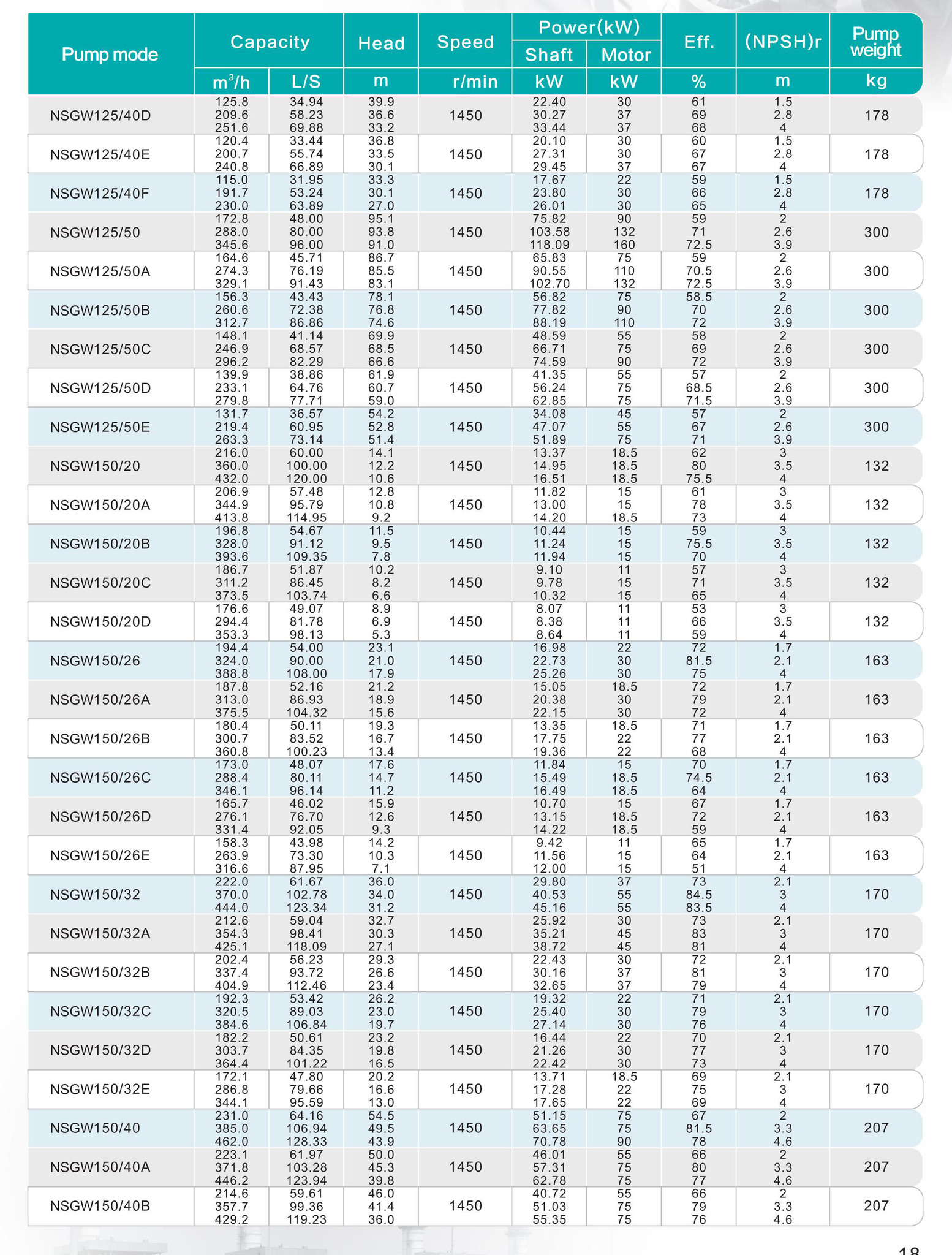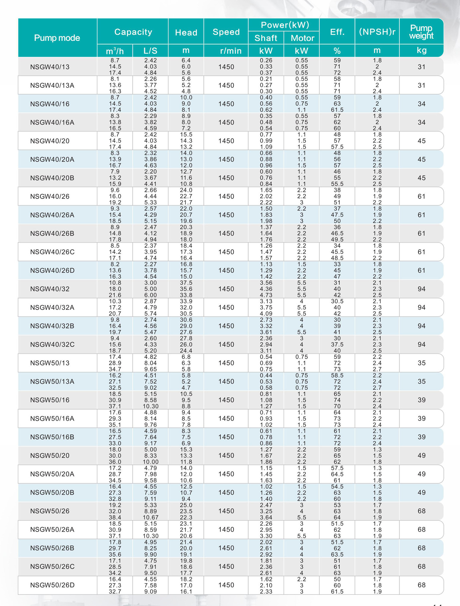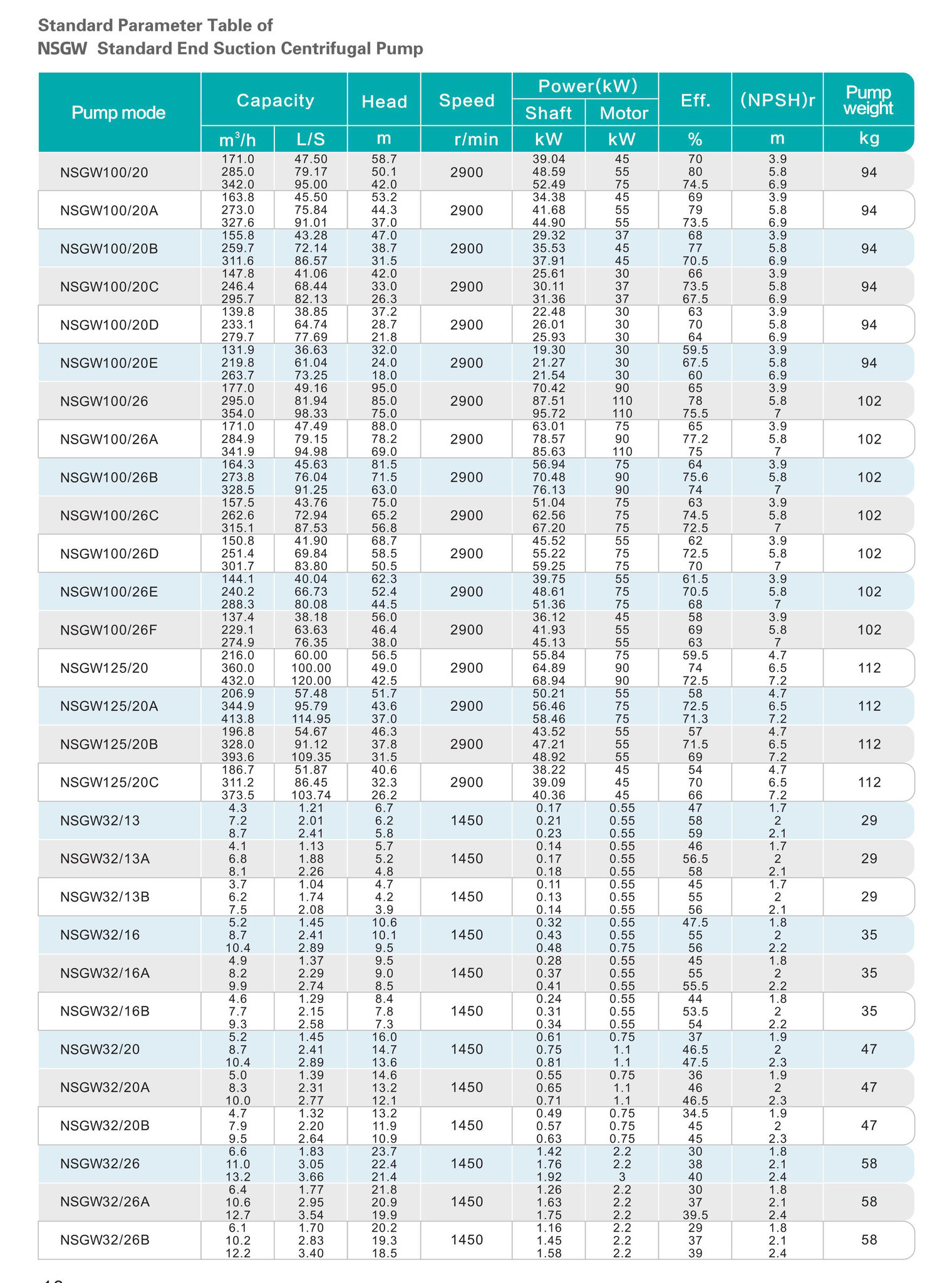 Насосы типа NSGW обладают широкой универсальностью, вся серия имеет 60 спецификаций, но валы используются только 4 видов, причем валы, подшипники, втулки, уплотнения валов, рабочие колеса, крепежные детали и т.д. одной спецификации могут быть взаимозаменяемы, а подвесок у всей серии насосов всего 5 видов.
