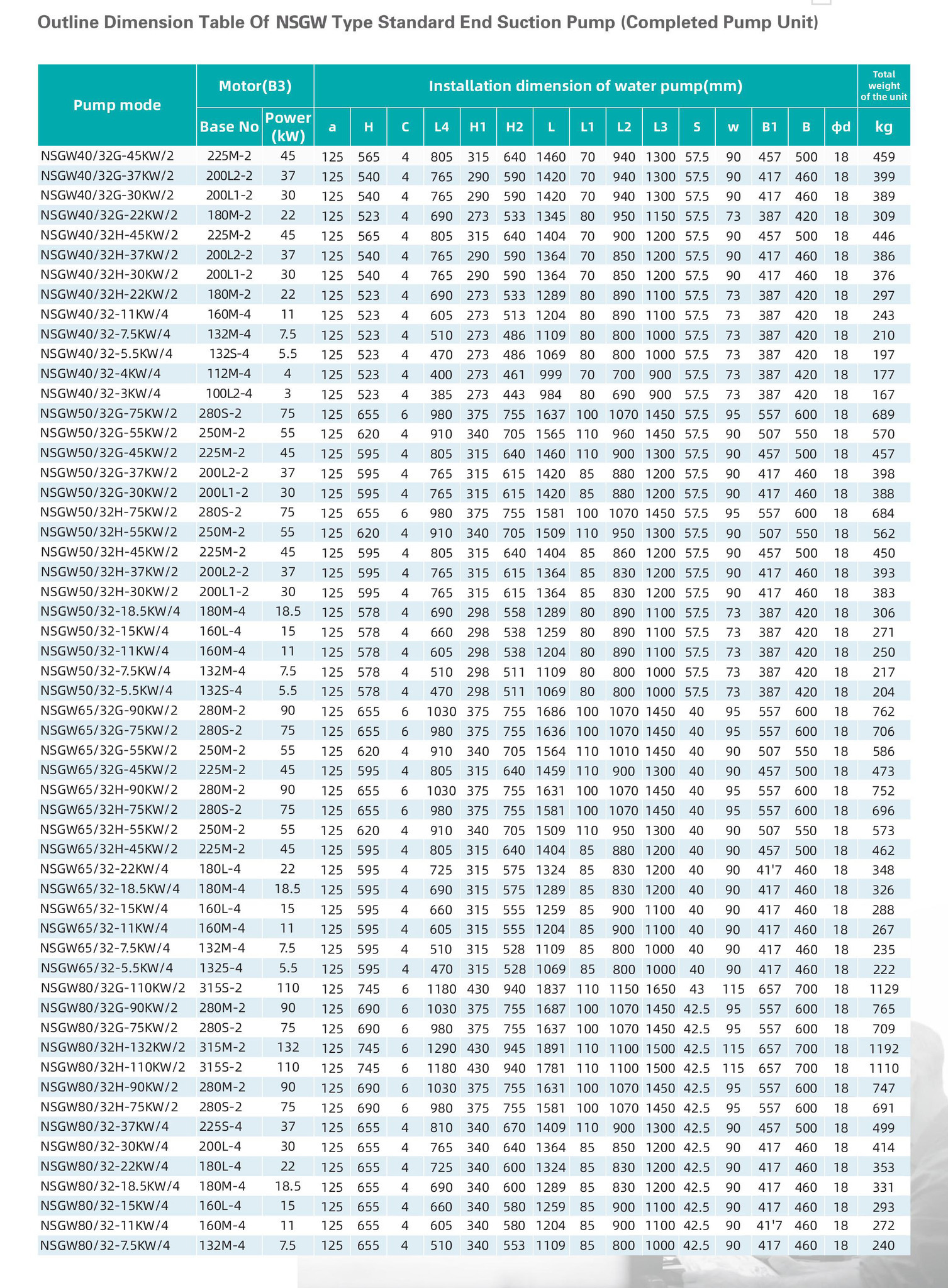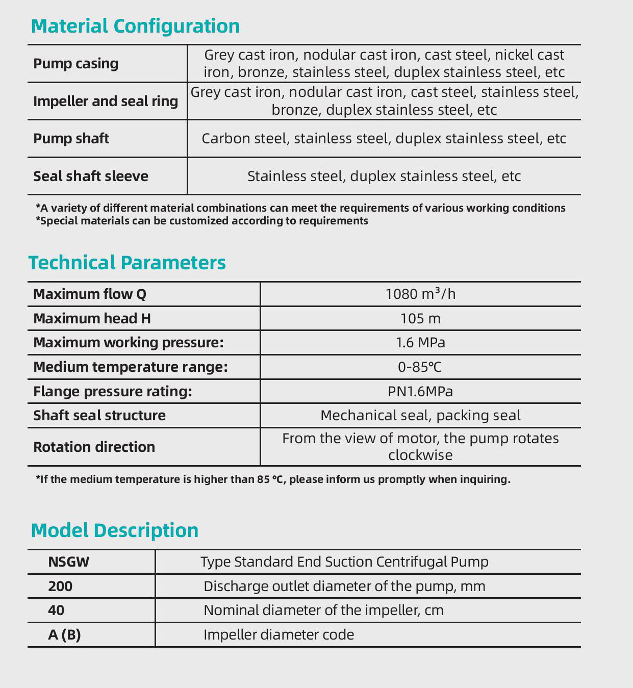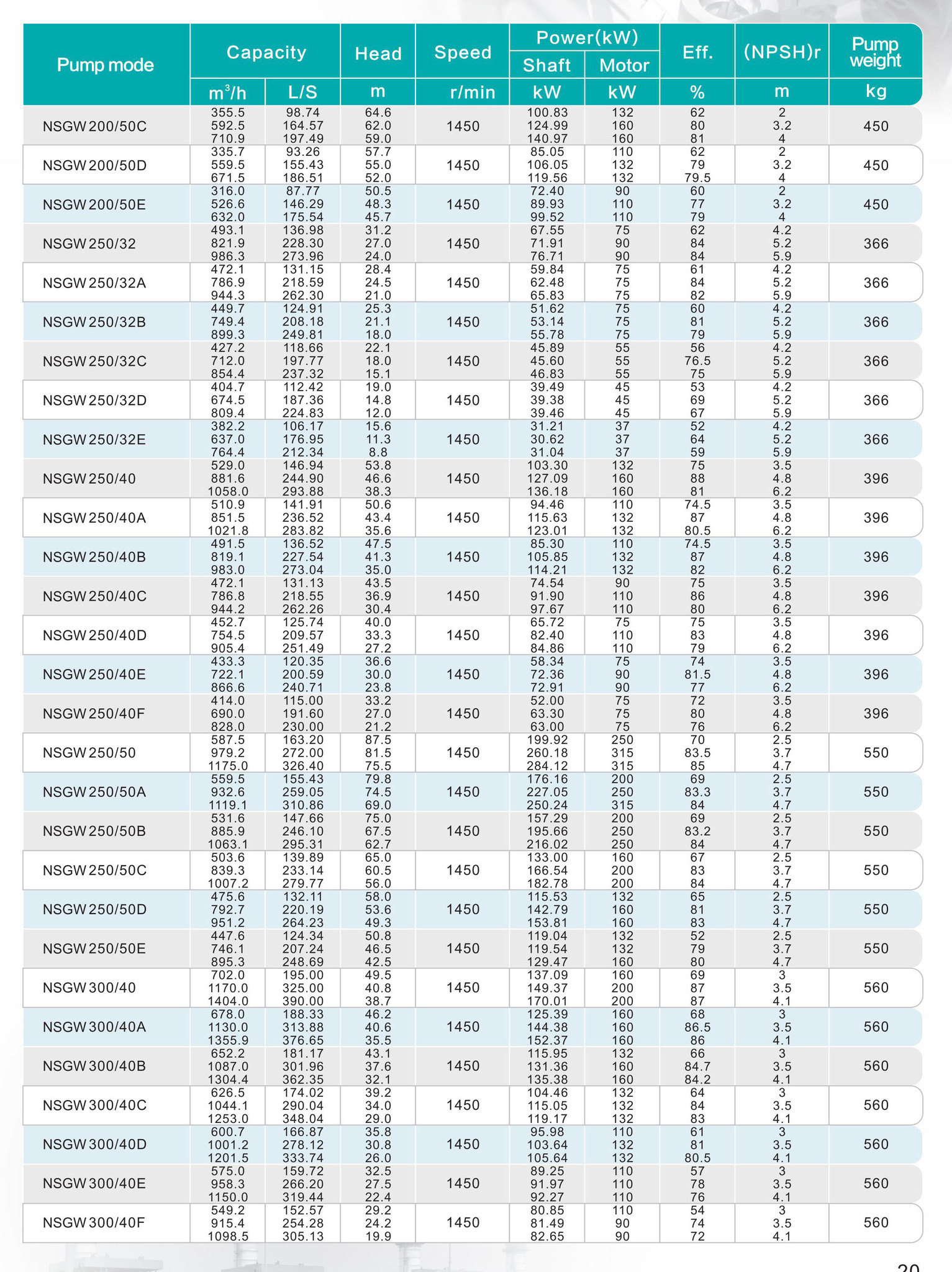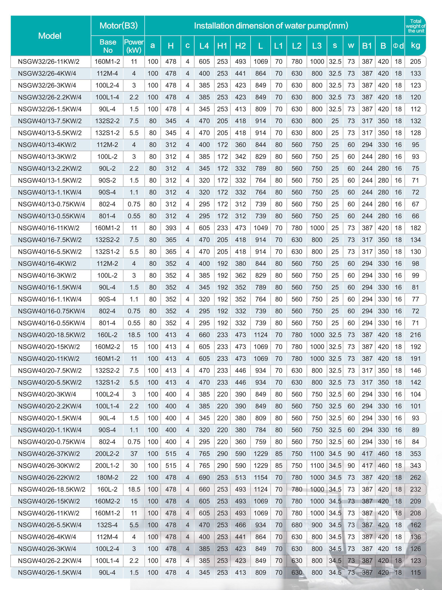 Насосы типа NSGW обладают широкой универсальностью, вся серия имеет 60 спецификаций, но валы используются только 4 видов, причем валы, подшипники, втулки, уплотнения валов, рабочие колеса, крепежные детали и т.д. одной спецификации могут быть взаимозаменяемы, а подвесок у всей серии насосов всего 5 видов.