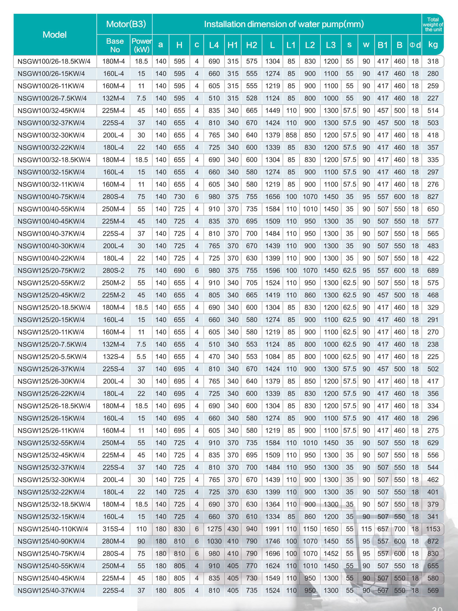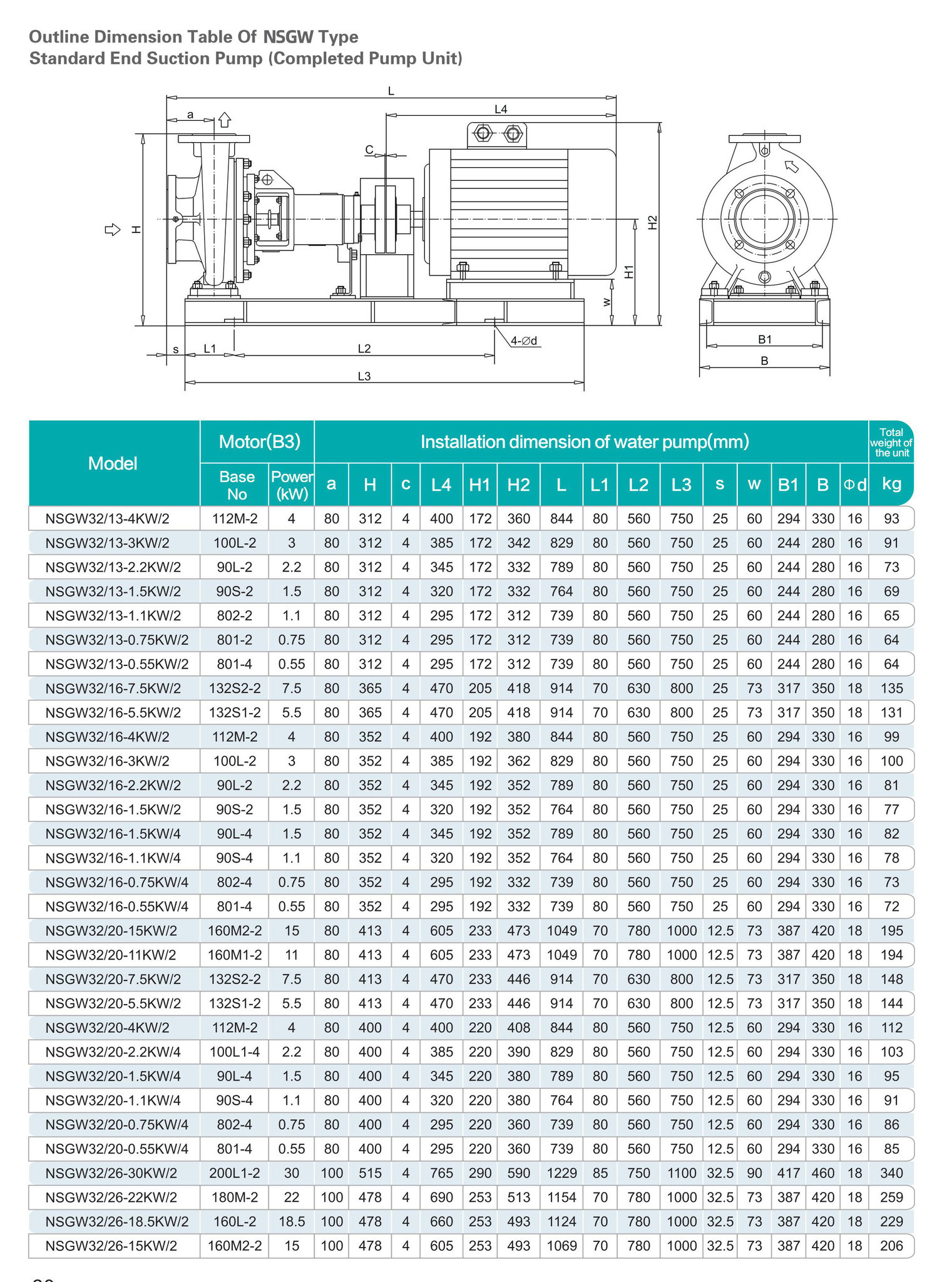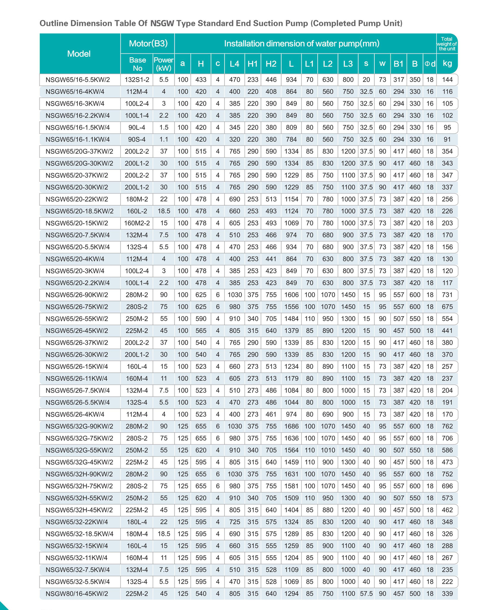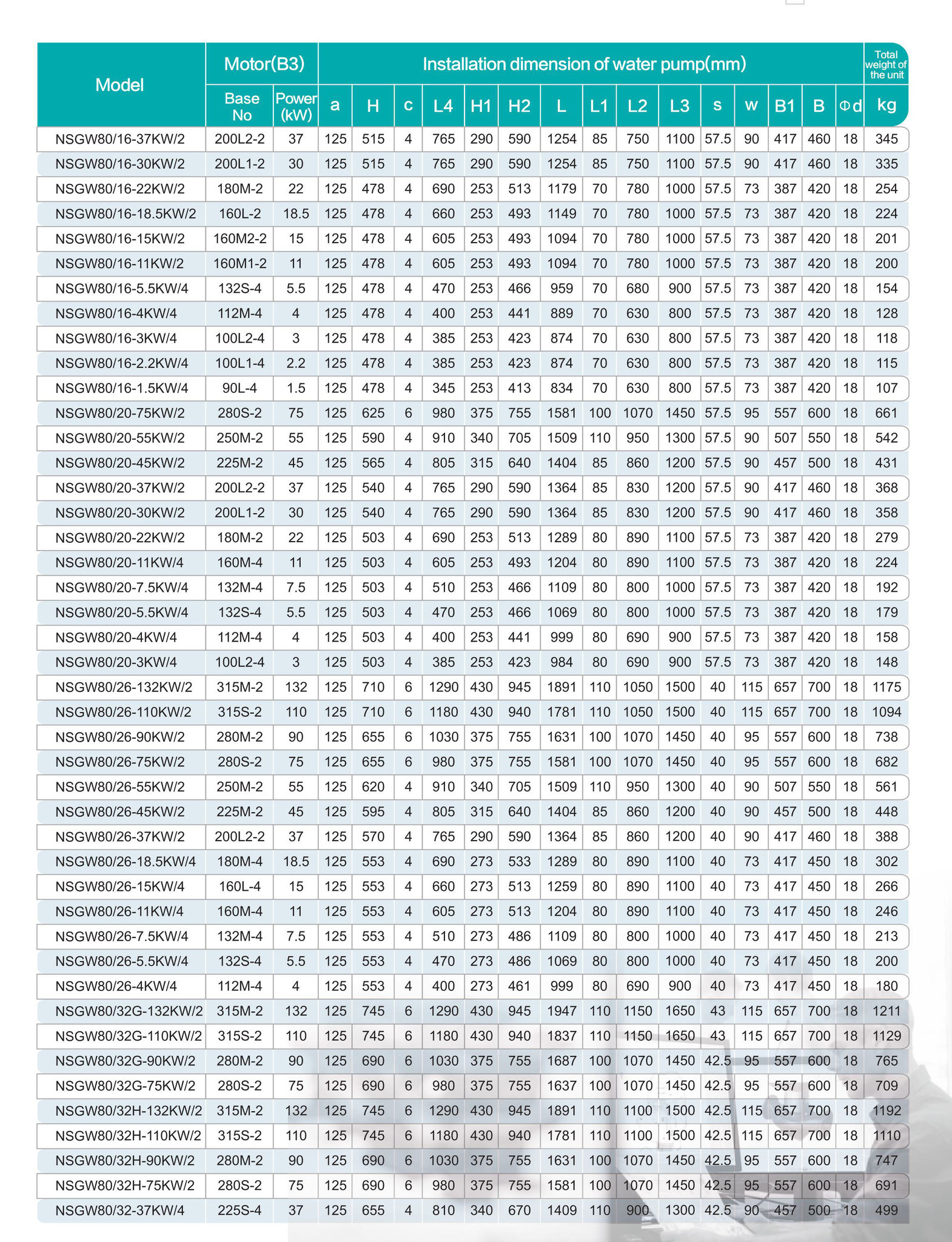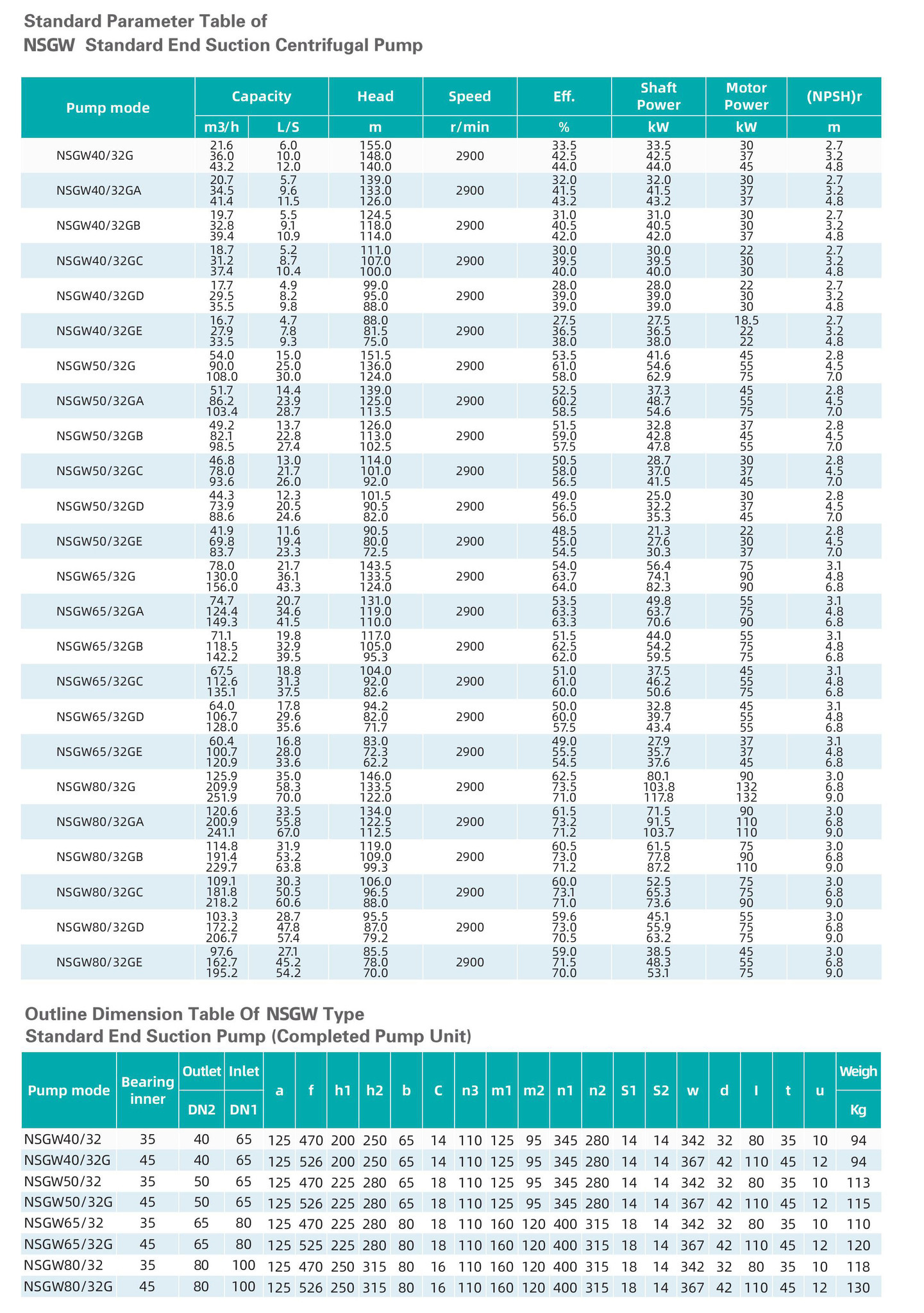 Насосы типа NSGW обладают широкой универсальностью, вся серия имеет 60 спецификаций, но валы используются только 4 видов, причем валы, подшипники, втулки, уплотнения валов, рабочие колеса, крепежные детали и т.д. одной спецификации могут быть взаимозаменяемы, а подвесок у всей серии насосов всего 5 видов.