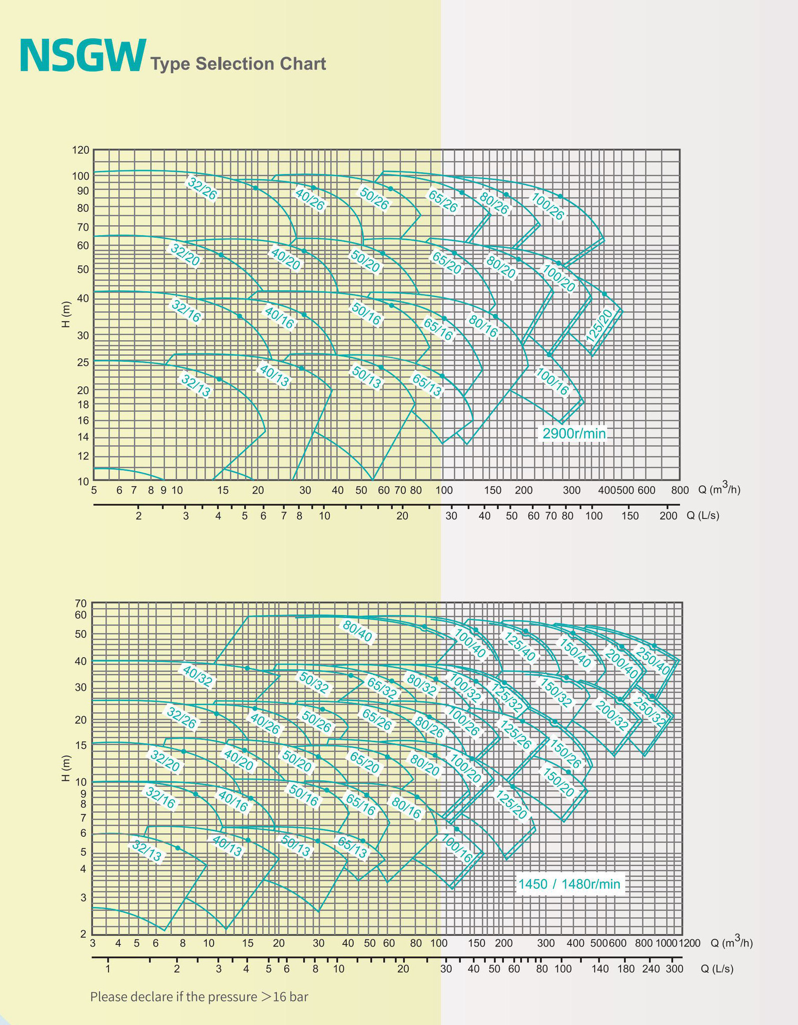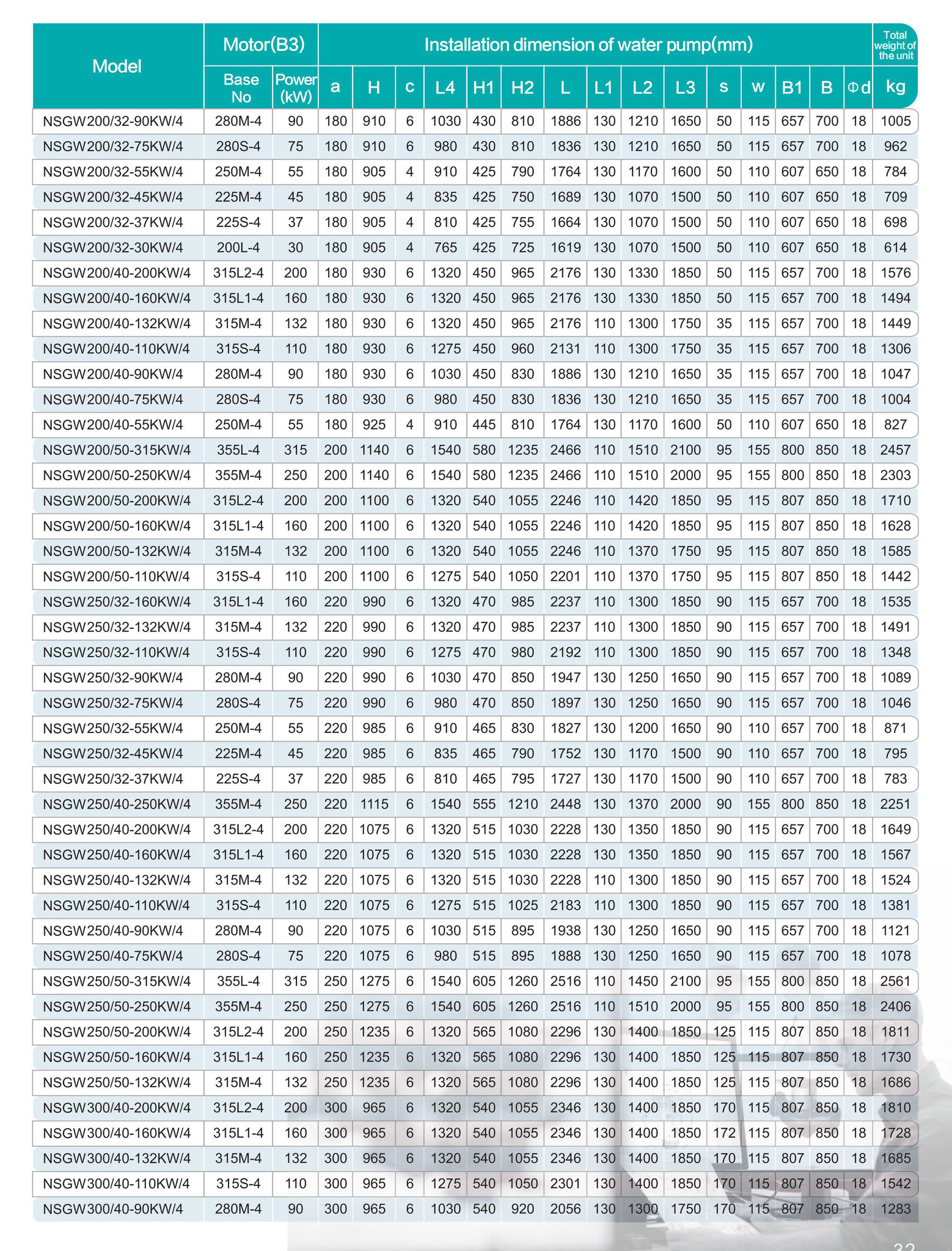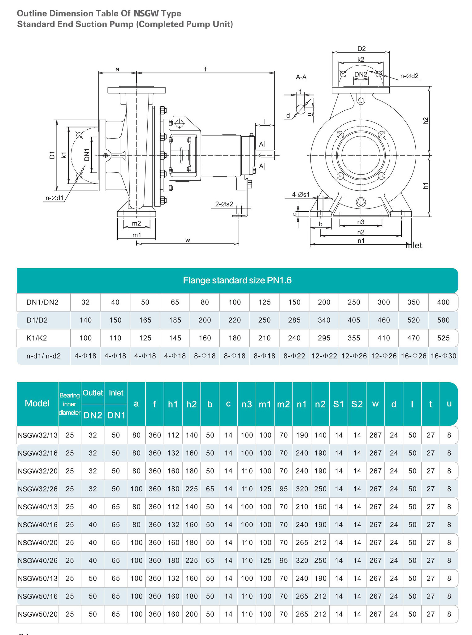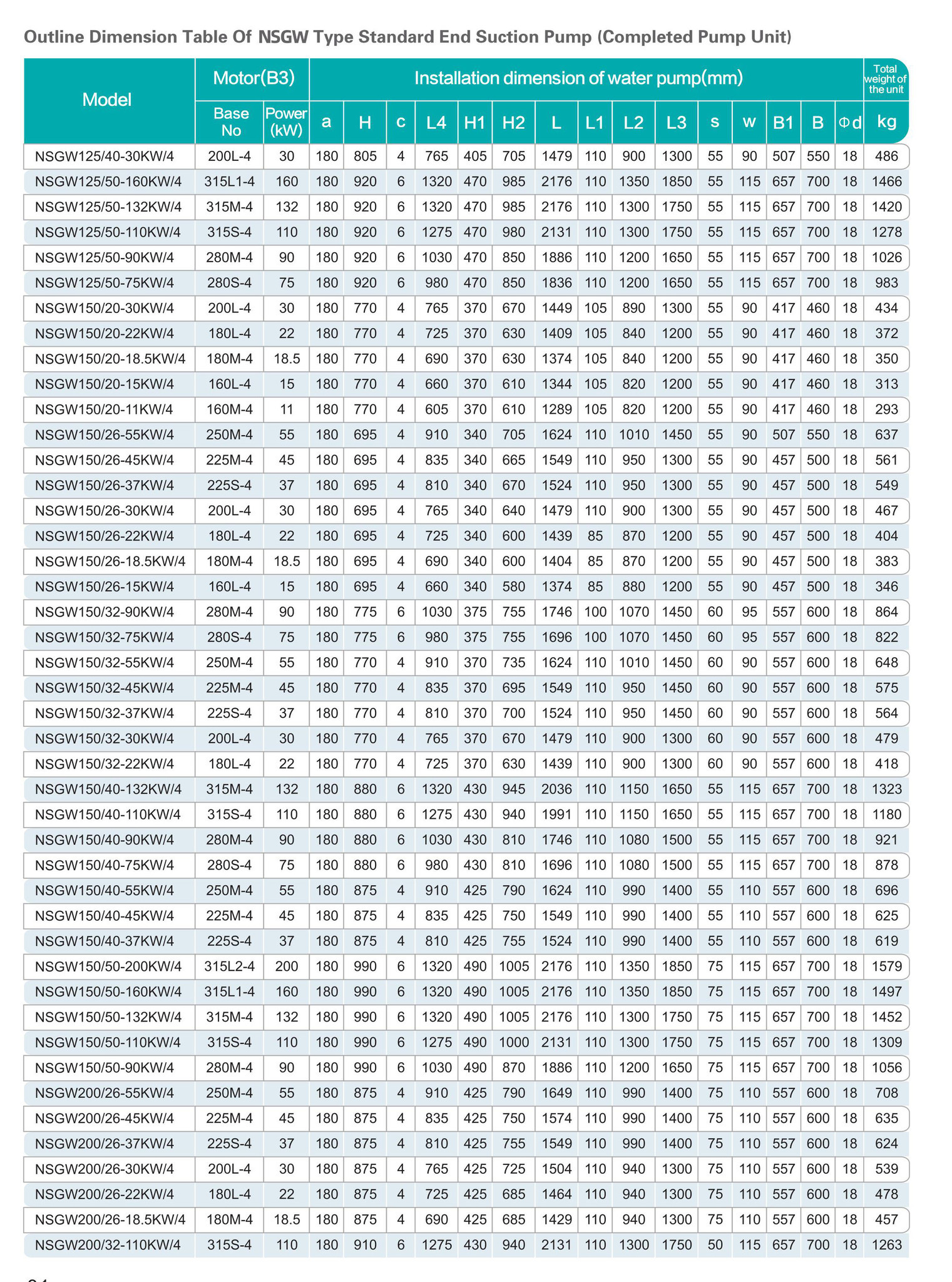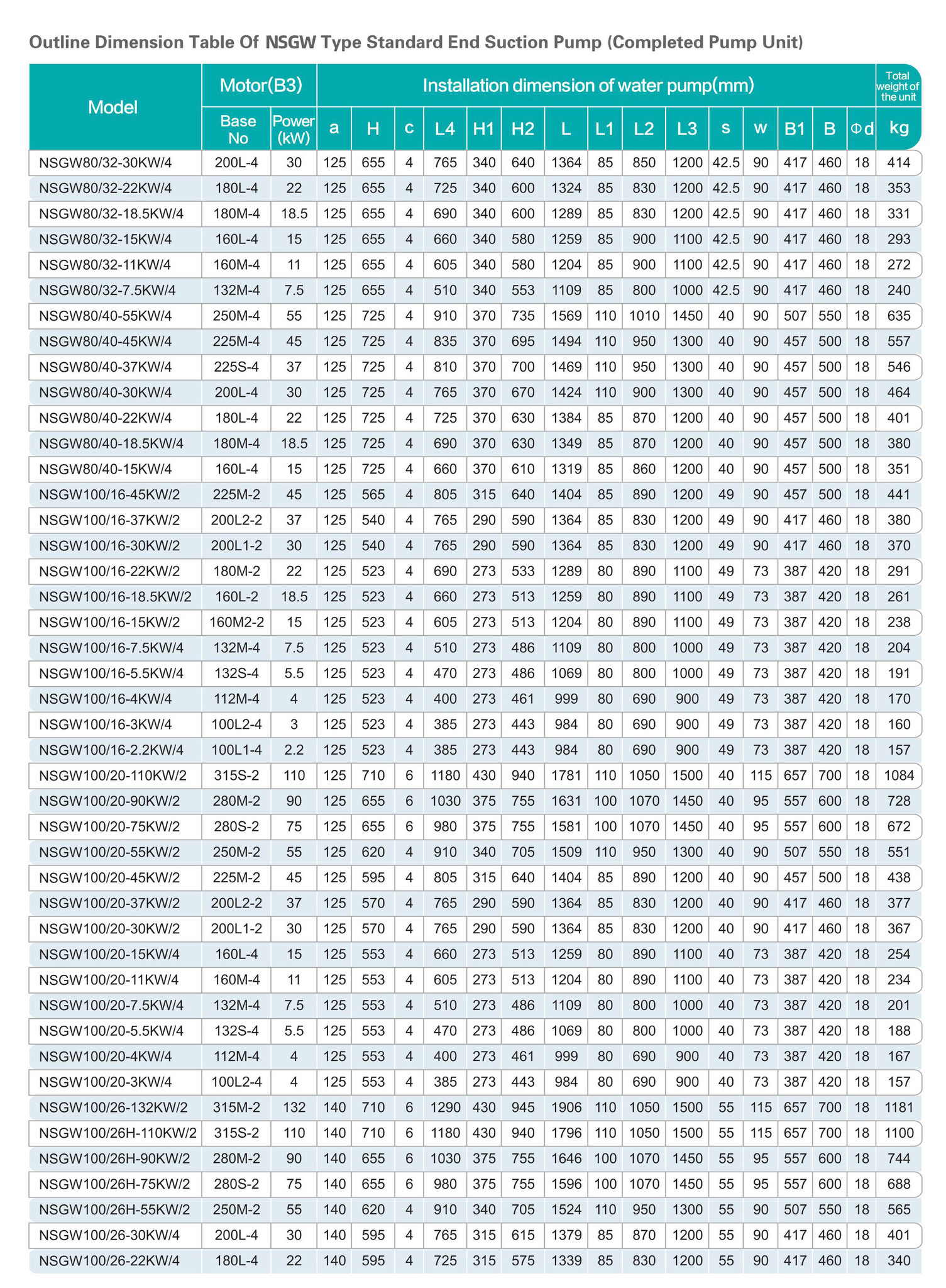 Насосы типа NSGW обладают широкой универсальностью, вся серия имеет 60 спецификаций, но валы используются только 4 видов, причем валы, подшипники, втулки, уплотнения валов, рабочие колеса, крепежные детали и т.д. одной спецификации могут быть взаимозаменяемы, а подвесок у всей серии насосов всего 5 видов.